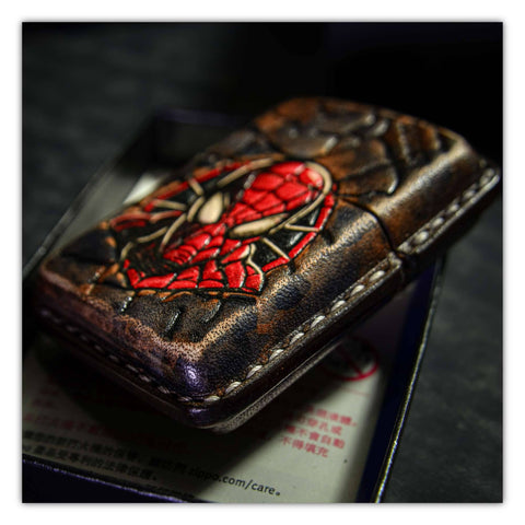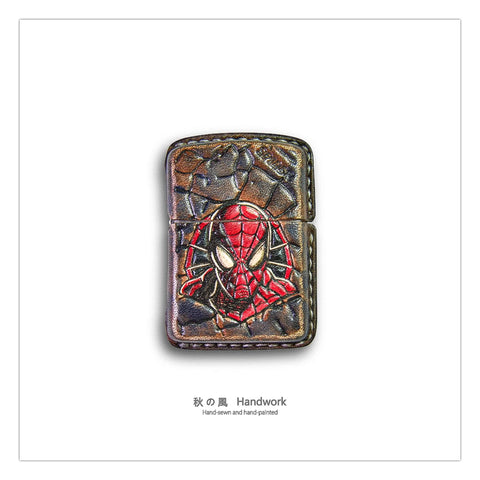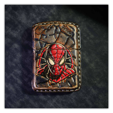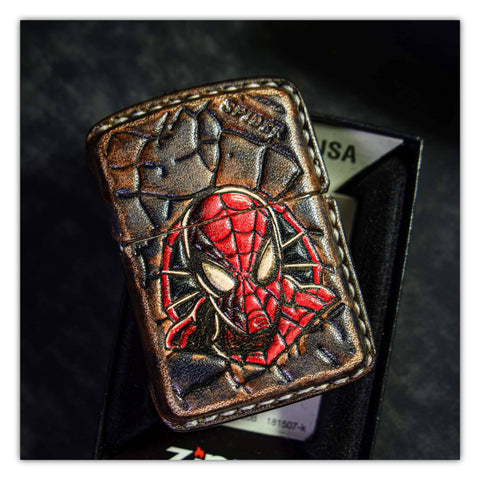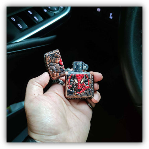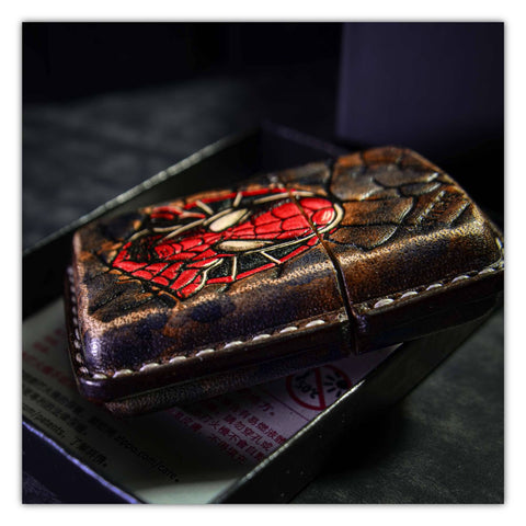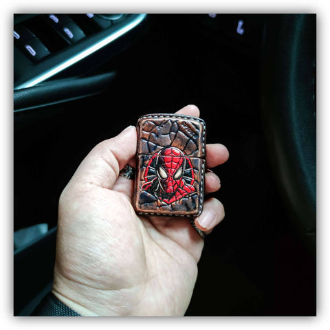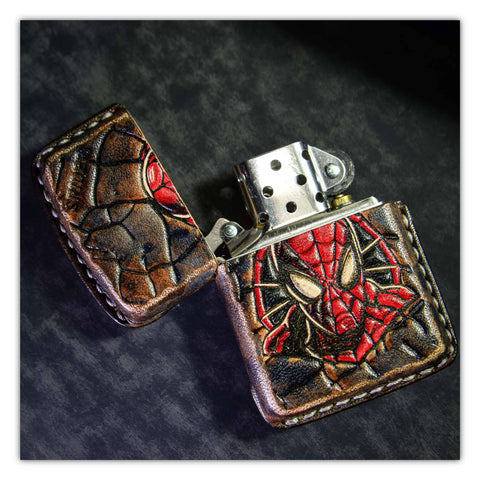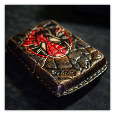Handgefertigte Zippo-Ledertasche. Originelles Design aus Rindsleder, hergestellt von Spider-Man